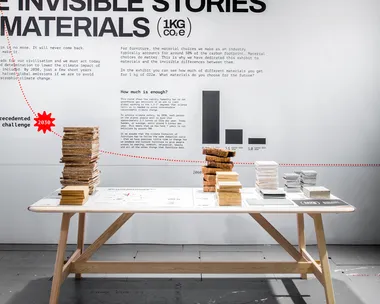 The exhibit is a starting point for anyone interested in the climate impact of materials, and we encourage everyone to dive deeper. Spend time online and visit sites like the Future Materials Bank and Doconomy’s 2030 Calculator.